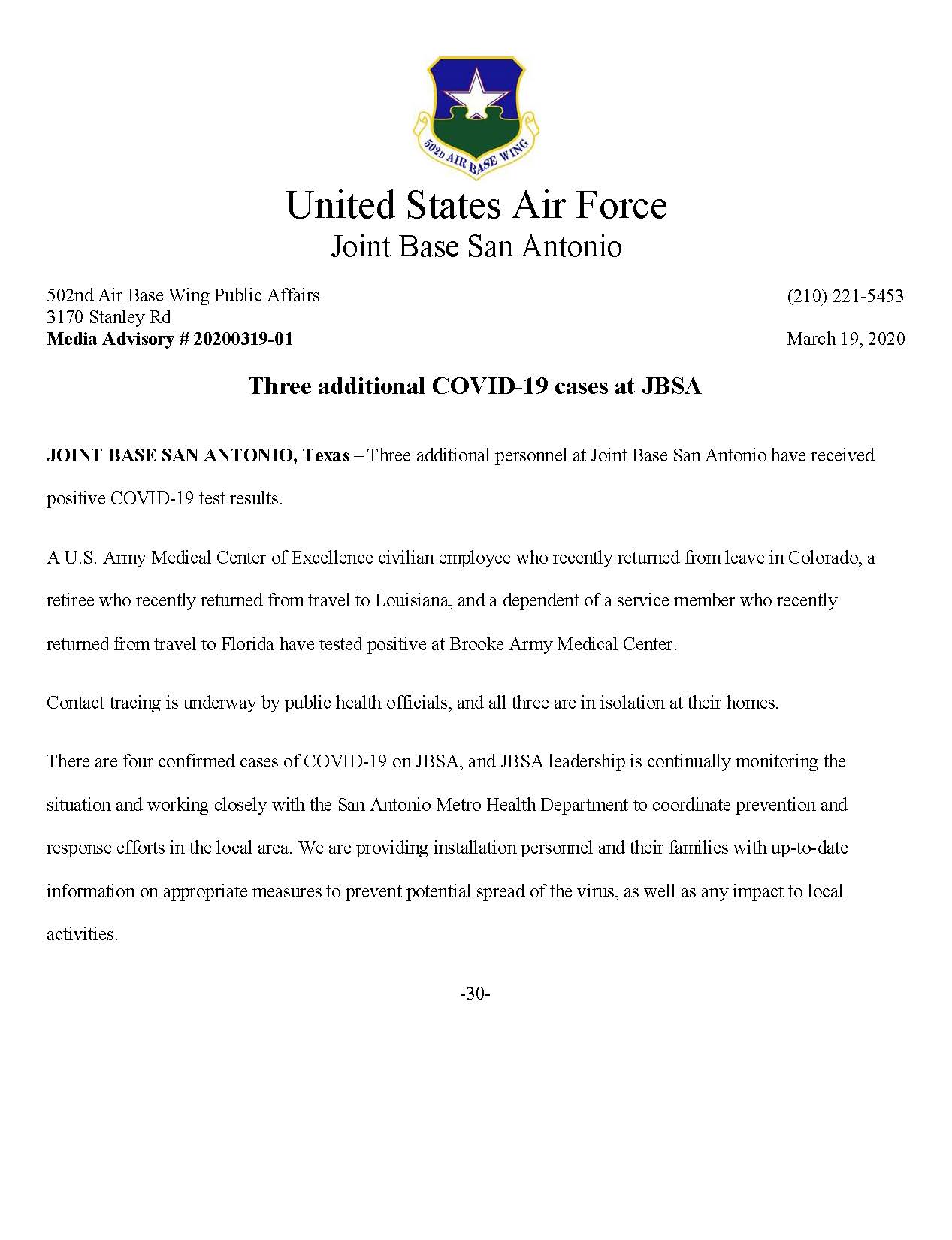 Jointbasesanantonio On Twitter Jbsaupdate Three Additional Personnel At Joint Base San Antonio Have Received Positive Covid 19 Test Results Https T Co Pjgwc6fcnw Twitter